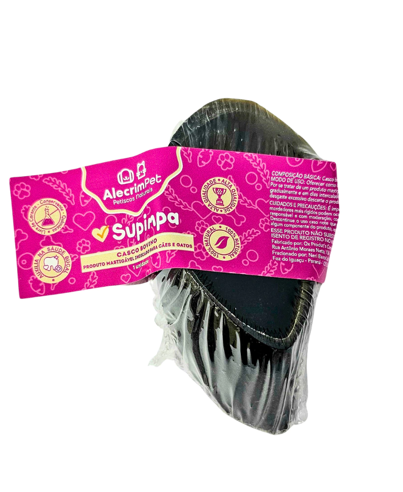 O Supimpa é natural de verdade, um casco selecionado, seguro e de alta qualidade. No processo de fabricação a etapa de higienização é super rigorosa e as temperaturas de desidratação são controladas e ideais para garantir a segurança microbiológica na hora do consumo do seu pet. Nosso acabamento e textura é na medida certa, o que assegura um consumo seguro. E o aroma? Hummm, por ser 100% natural é super atrativo o que vai deixar o rói rói ainda mais delicioso.